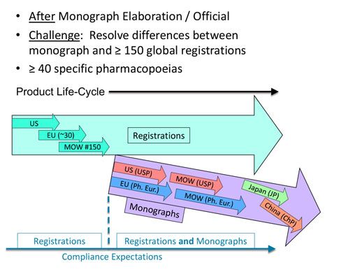 At the point when the pharmacopoeia monograph has been published as official, companies must comply with the new requirements contained therein, in addition to complying with their approved registrations. The question is how a company can resolve differences and ensure alignment with both the monograph requirements and the registrations. The answer is that this is done through modifications to testing procedures and limits in the quality standard and/or updates to the product registrations. It must be recognized that implementing these changes can have significant impact on available resources, either performing additional testing or submitting updates to 150 or more registrations around the world.