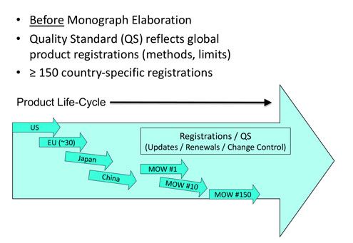 This situation, emphasizing the challenge of resolving differences between a new monograph in the pharmacopoeia for a drug substance or product and the information included in product registrations approved by regulatory agencies around the world can best be understood through an illustration that follows the product lifecycle. Figure 1 represents the situation for an innovator company before the monograph elaboration process has been initiated. The smaller arrows represent regulatory approvals received in various countries. Currently, the regulatory submission and approval often occurs first in the United States and Europe (covering 30 countries, when following the “centralized procedure” of assessment by the European Medicines Agency [EMA]). At this point in the product lifecycle, the approved registrations in the US and Europe are generally aligned, although there may be differences based on decisions by the regulators for one of the applications, such as revising an impurity limit from “not more than 0.1%” to “not more than 0.10%”, which tightens the limit based on generally accepted rounding rules for scientific data. The next submission might go to the Japanese health authority, with approval granted with some additional changes. The additional differences may be minor, such as the requirement to use six injections rather than five to establish the percent relative standard deviation (%RSD) for a chromatographic procedure. The arrow for Japan in Figure 1 is intended to show that some divergence is starting to emerge in the approved registrations. The next approval might come in China, again with the possibility of some differences compared to the approvals in the US and Europe. The drug applications continue, going next to a country designated as “Most of World #1” (“MOW #1”) and continuing to “MOW #10” and “MOW #150”. The arrows for these countries are intended to convey that the approved registrations in 150 or more countries are generally aligned, despite some differences. This is represented overall by the larger arrow, indicating at this point that the methods and limits in the quality standard (QS) may be used by the company to test the product and ensure compliance with the product registrations approved in 150 or more countries. Also at this point, the registrations and QS follow the typical process for updates and renewals to reflect subsequent regulatory requirements and manufacturing or analytical changes for the material.
