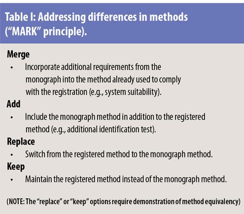 As noted previously, there is some flexibility in how a company chooses to comply with the monograph and registrations. However, in considering differences in analytical methods, the range of options is limited and includes the following: Merge, Add, Replace, or Keep. These choices can be denoted as the “MARK” principle (Table I), and the decision of which to apply will depend on the specific situation and the level of risk a company is willing to take. The most appropriate option often becomes clear when considering how significant the analytical method differences are. This is detailed below, with an indication of the potential impact to the analytical procedures and to the product registrations.