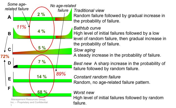 The proactive approach originated in 1978, when Nowlan and Heap published Reliability Centered Maintenance (RCM), the results of a 10-year study in the aviation industry (1). This analysis examined equipment function, common failures, the results of those failures, and the controls necessary to mitigate the consequences of failure. RCM showed equipment breakdown cycles to be radically different from what they were thought to be. Before this report, industry assumed that the probability of failure increased as equipment aged and that reliability could be ensured by equipment replacement or overhaul. Nowlan and Heap identified six different equipment behavior curves for equipment failure and found that most failures have no relation to age (see Figure 1).