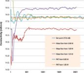 Conductivity control. The carefully prepared 1-L standard of 0.167 M sodium chloride gave a conductivity reading of 17.8 mS/cm, which was used as the programmed conductivity set point in the process-control software. Initially, the 1-M sodium-chloride concentrate delivered by the P002 pump was diluted in the blending loop by the WFI (P001) pump. Both pumps' frequencies were adjusted accordingly to obtain the programmed conductivity set point. The recorded WFI, concentrate, and blending-loop pump speeds were entered into a new method as pump preset start speeds. Starting from 1-M sodium-chloride concentrate, either mass-flow or PAT-based blending achieved the desired molarity with the targeted conductivity of 17.8 mS/cm (see Figure 4). Because of the presence of impurities, mixing inefficiency, and weighing errors, feedstock variability of 5% was expected.