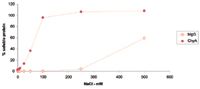 The effect of ionic strength on protein precipitation by tungstate. The effect of ionic strength on the precipitation of proteins by tungstate was investigated as many drug formulations contain salt. Figure 2 shows the effect of ionic strength on the precipitation of solutions of Chymotrypsinogen A (Chy A) and bIgG by tungstate at pH 5.0. The data indicate that 100 mM NaCl was sufficient to completely block the precipitation of ChyA by tungstate. In contrast, more than 500 mM NaCl was required to completely prevent precipitation of bIgG under the same conditions. In addition, higher concentrations of salt were necessary to block aggregation in the presence of 100 ppm tungstate than 10 ppm tungstate, and higher ionic strength was required to block aggregation by tungstate at pH 5.0 than at pH 5.5 (data not shown). These experiments show that the interaction of tungstate with proteins is primarily electrostatic and that the interaction is stronger at lower pH.