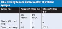 Tungsten and silicone content of prefilled syringes. Tungsten was analyzed using inductively coupled plasma–mass spectroscopy (ICP-MS, SCIEX Elan DRC II, Perkin Elmer). Tungsten was extracted from glass or plastic syringes by drawing up 1 mL 2% HNO3 or 1 mL 5% NH4OH and sonicating the filled syringes for 1 h at 50 °C. The extracts were dispensed and the syringes were flushed with an additional 1 mL of solvent. The extract and the rinsate were pooled and brought to 3 mL with water. The lower limit of quantification is ~2.5 ng/mL, corresponding to ~1 μg/syringe.