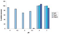 Figure 1: Effect of pH on the precipitation of bIgG by tungstate. Soluble monomer was quanititated by size-exclusion chromatography. (ALL FIGURES ARE COURTESY OF THE AUTHORS)