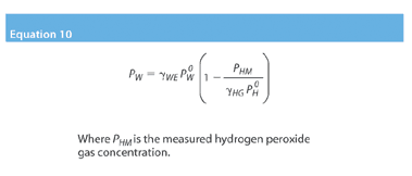 Equation 9 is the equilibrium relationship between water and hydrogen peroxide vapour above an aqueous solution. We can use this equation to find the relative humidity at which condensation will form - given the temperature and hydrogen peroxide gas concentration.