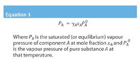 Equation 2, for the saturated vapour pressure of H2O2, was reviewed and published by Schumb.3 Using Raoult's Law it is possible to calculate the equilibrium vapour pressure of a perfect multicomponent liquid. Unfortunately, because of the bond formed between H2O2 and water molecules, Raoult's Law has to be modified by the addition of an activity coefficient (which is always less than unity), and is then expressed as follows (Equation 3):