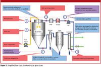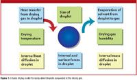 In a spray dryer, droplets or particles are dried while they are suspended in the drying gas. During the drying process, heat is transferred from the drying gas surrounding the droplets or particles, and solvent evaporates from the droplet or particle surface into the surrounding drying gas (see Figure 1). The process also involves various complex diffusion processes, most of which are specific to the product–solvent combination used. This complexity makes liquid-feed composition an important part of early process development. Because the liquid-feed composition rarely can be used for process-control purposes, however, the parameters available for process control are drying temperature, drying-gas humidity, and droplet size.