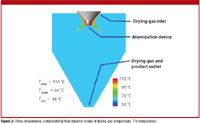 In a spray dryer, it is important to distinguish between dryer-inlet temperature, product temperature, drying temperature, and dryer-outlet temperature. In a well-designed cocurrent spray dryer, the intense mixing of spray and drying gas results in fast cooling of the drying gas by the evaporation of solvent. The end result is that the temperature in the drying chamber is practically equal to the spray-dryer outlet temperature. This parity can be measured and calculated with computational fluid-dynamic models (see Figure 2).