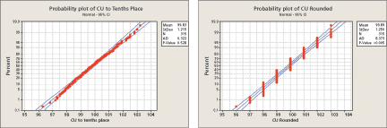 Measurement resolution. It is best to keep the data to as many significant figures as possible for use in data analysis. When the data are subjected to high-level rounding, although the underlying data might be normal, the result may be non-normal data. This degree of rounding not only affects normality, it makes decision-making difficult. The content uniformity data in Figure 6, original and rounded, clearly show that the uniformity results in the “tenths” place pass the Anderson-Darling normality test, but fail the test when the data are rounded to the “ones” place. The normal probability plot shows the evidence of rounding and that the underlying distribution is most likely normal given how the points surround the line evenly.