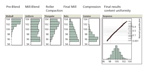 Similar to the process of rolling a die five times, pharmaceutical manufacturing processes and the data that result from the processes are usually the combination of at least several sub-processes. In producing a tablet, the sub-processes might occur as: blend, mill, blend, roller compact, mill, and compress. These sub-processes create in-process material distributions, each of which is not necessarily normally distributed. Regardless of the individual distributions of these sub-processes, if there are several, and their variability is of similar magnitude, the final data will be normally distributed. This may seem like magic but Figure 3 provides illustrative proof. The example distributions (Weibull, Uniform, Triangular, Beta, and Gamma) are not meant to be representative of actual manufacturing distributions; they were selected to illustrate that the mathematical principle works even when using these “non-normal” distributions. To interpret Figure 3, assume that the pre-blend process acts on the material, producing a result that over time, would follow a Weibull distribution. The material is then passed to the mill, and the mill-blend process acts independently of the pre-blend process, and adjusts the material per a uniform distribution. The material is then passed to the roller compactor that acts independent of the previous processes and adjusts the material in a triangular fashion. The final mill creates an adjustment distributed as a beta and the compression process as gamma. If several lots would be made in this fashion, those independent data distributions would result in a normal distribution of the final product. Several hundred lots are displayed in Figure 3. A true departure from normality may occur in a number of ways: