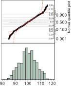 - The final graphical tool for assessing the distribution of a set of data is the normal probability plot (i.e., normal quantile plot). Figure 2, right panel, shows the content uniformity data in a normal probability plot. The x-axis scale represents the percentiles of a normal distribution. When data are plotted against this scale, the points should fall along a straight line if the data are normally distributed. It is not essential that the data form a perfectly straight line, only that they be close. One practical approach is to imagine that the graph is on a piece of paper and that a fat pencil is placed on the graph. This fat pencil should be able to cover most of the points if the data are reasonably approximated by a normal distribution.
