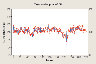 Correlation of the data over time. Figure 7 contains developmental content uniformity data from a single compression run plotted in the order it was manufactured. The results display that the data are time-dependent or autocorrelated. This means that the current content uniformity result is somewhat dependent on what happened during the time period just before it. This time-ordered dependency is found in almost all manufacturing processes and may be induced by factors such as common raw materials, environmental conditions (relative humidity and temperature), and feedback control of the process. The data in Figure 7 do not pass a statistical test of normality. The data cover a narrow range, 95-105% label claim, and represent excellent control of content uniformity. Failing the normality test does not imply poor quality.