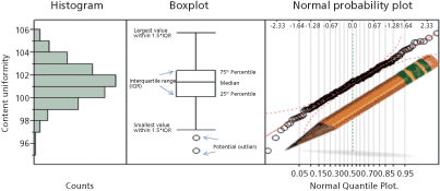 - Figure 2, middle panel, is a boxplot of the same content uniformity data shown on the left. The data set is represented by a box and lines that extend past the top and bottom of the box. The line across the middle of the box is the median (middle value) of the data set. The top of the box is the 75th percentile (75% of the data are below the top of the box) and the bottom of the box is the 25th percentile. The box encompasses the middle 50% of the data. If the data follow an approximately normal distribution, the median should be near the center of the box and the lines extending out from the box should be roughly the same length. The difference between the 75th and 25th percentiles is called the interquartile range. The lines coming out of the box at the top and bottom extend to the largest and smallest data values that are within 1.5 times the interquartile range from the box. If there are values beyond that limit, they are plotted as individual values (stars in Figure 2). Note that two values are plotted as stars on the bottom indicating that these values are worth investigating to make sure they are truly a part of the data distribution.