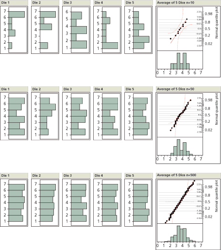 The second reason that the normal distribution is used is that most statistical methods employ some level of summing or averaging of the individual data points. A useful theorem in statistics, *The Central Limit Theorem, states that sums and averages tend to follow a normal distribution, no matter what distribution the individual data values come from. For a real-life example, consider rolling a six-sided die a given number of times and take averages of the results from those rolls. Assume that a die is rolled five times, and the average of the five results (“rolls”) is collected. This process is repeated a large number of times, say 10, or 50, or 500 times. On roll 1, the result is 6, on roll 2 the result is 4, roll 3 produces a 4, roll 4 a 2, and roll 5 is a 3. The sum of these numbers is 19 and the average is 3.8. Although it is equally likely to receive a 1, 2, 3, 4, 5, or 6 from any individual roll of the die, and thus the distribution of any roll is flat or uniform (i.e., not “normal”), the distribution of the five-roll average appears to be unimodal, symmetric, and bell-shaped, approaching “normal” as the process is repeated a large number of times. Figure 1 shows the distribution of each roll, with the resulting distribution of the average when the process is repeated 10, 50, and 500 times. Note that the uniform nature of the distribution of individual data and the “normal” appearance of the distribution of the averages hold and are easier to visualize as the sample size increases (1).
