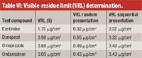 The results of the VRL determinations for both the random and sequential presentations are shown in Table VI. The random coupon presentation provided comparable results to the sequential coupon presentation. For both the sequentially and the randomly presented coupons, the experimentally determined VRLs were lower than the previously determined VRLs for three of the compounds and higher for the fourth. The lower VRLs resulted from spotting lower concentrations than in the initial VRL determination. The initial determinations were deemed acceptable because they were sufficiently lower than the swab limit or ARL (2). The sample preparation used for the more recent VRL determinations resulted in lower overall VRLs and a more rugged data set (6).