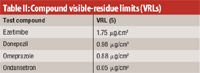Visual inspection is always a component of a cleaning-validation program, and routine visual inspections for equipment cleanliness are a crucial part of day-to-day operations in a pharmaceutical facility (21 CFR 211.67 (b)-6). Visible-residue limits (VRLs) can be established for the active pharmaceutical ingredients (APIs), excipients, and detergents processed in the facility. The VRL of the API is generally the greatest concern because the API is the most potent component of the formulation. If the VRLs are lower than the health-based and adulteration-based acceptable residue limits (ARLs) as determined by the company, then the VRL is a viable approach to assess the equipment cleaning in the facility (1).