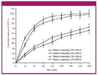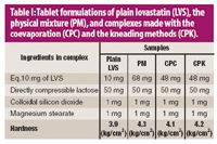 Table I: Tablet formulations of plain lovastatin (LVS), the physical mixture (PM), and complexes made with the coevaporation (CPC) and the kneading methods (CPK).