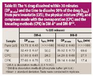 Table III: The % drug dissolved within 30 minutes (DP30 min) and the time to dissolve 50% of the drug (t50%) from pure lovastatin (LVS), the physical mixture (PM), and complexes made with the coevaporation (CPC) and the kneading methods (CPK) in DM-A* and DM-B**.