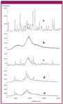 The IR spectrum of the HPβ-CD is characterized by intense bands at 3300–3500 cm–1 because of O–H stretching vibrations. The vibration of the –CH and CH2 groups appears in the 280–3000-cm–1 region. The spectrum patterns of the physical mixture correspond with the superposition of the IR spectra of the two components. The absence of characteristic peaks of LVS and the presence of characteristic peaks caused by HPβ-CD in the IR spectra of complexes prepared by the coevaporation and the kneading methods indicate that LVS is inside the cavity of HPβ-CD. The IR spectra of the physical mixture and complexes prepared by the coevaporation method and the kneading methods showed most of the characteristic peaks were similar to that of HPβ-CD, except one peak at 1700 cm–1 for lactone and ester carbonyl stretching vibration (hydrogen bonded for 1711 and 1700 cm–1 ), which is characteristic of LVS. This effect indicates that the pyrol part of LVS remains outside the HPβ-CD, whereas the remaining part fits inside the HPβ-CD cavity.