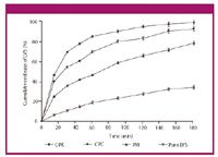 Figure 9: Comparative drug-release profiles of conventional tablets containing lovastatin (LVS) and tablets containing a complex made with the kneading method (CPK) in dissolution media-A (0.1 N HCl) and dissolution media-B (phosphate buffer [pH 6.8]) (tests performed in triplicate).