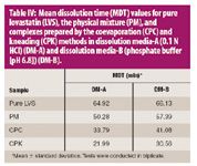 Table IV: Mean dissolution time (MDT) values for pure lovastatin (LVS), the physical mixture (PM), and complexes prepared by the coevaporation (CPC) and kneading (CPK) methods in dissolution media-A (0.1 N HCl) (DM-A) and dissolution media-B (phosphate buffer [pH 6.8]) (DM-B).