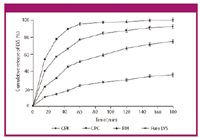 Figure 7: In vitro dissolution profiles of pure lovastatin and its physical mixture and complexes in dissolution media-A (0.1 N HCl) (tests performed in triplicate). CPK is the kneading method, CPC is the co-evaporation method, PM is the physical mixure, and LVS is lovastatin.