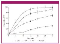 Wettability and dissolution studies. The wettability study was performed using open tubes containing LVS, the physical mixture, and complexes prepared by the coevaporation and the kneading methods. The tubes were placed with their lower capillary ends dipped into colored water (0.01% eosin in water). The upward migration of the colored front was registered as a function of time. The porosity of all samples also was measured using a mercury porosimeter (PoreMaster 60, Quantachrome Instruments, Boynton Beach, FL). Porosity is defined as the percentage of void space in a solid. Mercury density (ρHg) and helium density (PHe) values often are used to evaluate % porosity (€) (20). Each test was repeated four times and the mean was calculated.