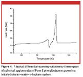 Solvent combinations for phenylbutazone.The four different solvent combinations of good solvent, antisolvent, and bridging liquid for phenylbutazone were: tetrahydrofuran, water, n-heptane; 1,4-dioxane, water, and n-heptane; acetonitrile, water, and n-heptane; methanol, water, and n-heptane. Spherical agglomerates (see Figure 2) of the first two cases were made of Form E crystals (see Figure 3), whereas the last two cases were made of Form A crystals as indicated by DSC. Form A showed only a single melting endotherm at 105 °C for Form A, but the DSC thermogram (see Figure 4) exhibited the first endothermic peak at 92.5 °C , which corresponded to the melting of Form E (3). This peak was followed by an exothermic peak at 95 °C, which corresponded to the crystallization of Form E (3). A second endothermic peak at 104 °C corresponded to the melting of Form A (3). Because the equilibrium solubility and the dissolution rate of the phenylbutazone crystal forms were in the order of Form C > Form E> Form D > Form B > Form A and Form C > Form E > Form B > Form D > Form A, respectively, spherical agglomeration might offer a way of tuning the dissolution profile of phenylbutazone by the change of polymorphism in addition to providing good bulk flowability.