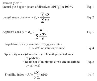 Powder characteristics. The polymorphism of the API solids remained unchanged before and after the addition of a bridging liquid in the previoulsy described 18 solvent systems. Other powder characteristics of the spherical agglomerates from the 18 solvent systems such as the percent yield, the length-mean diameter, the apparent density, the population density, the sphericity, and the friability index were fully analyzed based on the sample weight and digital-camera photographs and were calculated according to Equations 1–6 as follows (22, 26, 40):