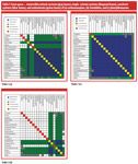 Form spaces. To construct the form space for an API, which contains the possible solvent combinations for discovering a new polymorph, the 19 common solvents for scale-up listed in the materials and methods section of Part I of this article were arranged from top to bottom vertically and from left to right horizontally in ascending order of the solvent's Hildebrand value (1). This arrangement resulted in a 19 × 19 matrix of 361 boxes (see Tables 1(a), 1(b), and 1(c)). Each box represented a specific binary solvent combination except for the 19 boxes located diagonally in the matrix stepping down from the upper left-hand corner to the lower right-hand corner. The 19 diagonal boxes represented the 19 pure-solvent systems. The yellow boxes were the good solvents (i.e, defined as a solvent that gave solubility of ≥ 5 mg/mL at 25 °C) and the red boxes the bad solvents (i.e, defined as a solvent that gave solubility of ≤ 5 mg/mL at 25 °C) with respect to a particular API. The yellow and red boxes were the materials properties of the API. The gray boxes also were determined experimentally. They represented the immiscible solvent pairs that were independent of the API. Once the locations of the red, yellow, and gray boxes were fixed, the location of the green, blue, and white boxes representing the antisolvent system (i.e., a good solvent and a bad solvent), the good cosolvent system (i.e, a good solvent and a good solvent) and the bad cosolvent system (i.e,. a bad solvent and a bad solvent), respectively, were deduced graphically from the diagonal boxes. Since the 19 × 19 matrix was symmetrical along the diagonal boxes, the actual possible solvent combinations were reduced from 361 boxes to a total of 190 boxes or less (i.e., derived from 19 + (361 – 19) ÷ 2 = 190) because it is impractical to perform experiments in the white-boxed areas.