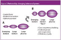 Figure 3 shows the changing balance of power in partnerships. In the future, pharma and biotech companies will move towards alliances where risks and rewards are shared. Many key alliances show the trend is no longer to secure large up front payments and milestone commitments, but to retain a larger share of downstream revenues. More competition in the licensing market means that biotech firms are now able to structure deals that give them higher ownership levels and more long-term involvement in a drug.