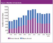 Figure 4 shows the number of new deals. Since 1999, the deals between biotech companies have increased compared with pharma–biotech deals. Industry sources have shown that during the period 1996–2001 the number of new deals has doubled. Since 2001, when the global economy has experienced challenges, the number of deals has stabilized. Millennium, Amgen, Incyte and Genomics are key biotechnology companies involved in strategic alliances.