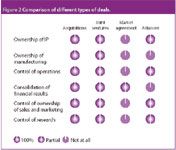 Figure 2 shows the comparison of different deal types. It is interesting to see that alliances and corporate partnering offering a degree of flexibility and risk management. The problem with joint ventures, for example, is that although scale of efficiency is achieved from this form of partnership, it can create potential ownership and accounting issues.