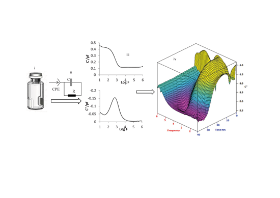 To explain the observed impedance spectrum of the object under test and relate it to the physical properties or changes that may happen during the freeze-drying process, it is necessary to create an appropriate equivalent circuit model. The circuit model (see Figure 2ii) was found to provide an approximate fit to the measured impedance spectrum, where CPE denotes a contant phase element and models the interfacial capacitance formed between the glass walls of a vial and the solution, which is charged through the resistance (R) representing the conductivity of the sample, and C represents the electrical capacitance of the material within the internal volume of a vial. This interfacial polarization imparts a frequency-dependence to the measured dielectric properties, such that the interfacial capacitance will have sufficient time to charge completely at low frequency, but at high frequency, it will not have time to begin to accumulate any of the electrical charge that could otherwise be accommodated.