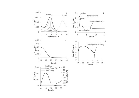 During the last stage of primary drying, the spectra exhibit a certain degree of low frequency noise. At this point (> 20 h), the data-analysis software begins to “locate” the peak at a progressively lower frequency. These uncertainties preclude the use of the pseudo-relaxation peak in determining the end point of the primary-drying phase. While the peak-versus-time profiles are of value in the measurement of temperature changes and in characterizing the various stages of the freezing step, an alternative approach is required for the determination of the end point of primary drying. This alternative approach is to examine the logarithm of the time slice of the capacitance derivative at 1 kHz, which is the predominant position of the pseudo-relaxation peak during primary drying. It has been shown that the alternative approach provides acceptable information regarding the measurement of the end point of sublimation. This is illustrated in Figure 3d, in which the end point of primary drying can be observed from the sharp decrease at approximately 27 h.