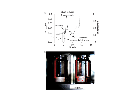 During sublimation, the time derivative of the capacitance increases to a maximum and then decreases to zero (see Figure 3e). In the collapse study (see Figure 5), the increase in shelf temperature at 5 h into the primary-drying cycle results in an increase in product temperature and an increase in drying rate. The increased drying rate is evident from the inflection in the dC”/dt plot (left hand vertical line on Figure 5a). However, as the temperature rises further, it reaches critical levels, whereby the viscosity of the glassy matrix has decreased to such an extent that its walls are unable to support its structure. At this point, the product is seen to collapse (see Figure 5b), and there is a small spike in dC”/dt as the product at the sublimation front loses its integrity. Photographic evidence of the product collapse were found to correlate well with the occurrence of this small spike. In the later stages, the softened mass at the sublimation front merges to produce wider pores that result in higher sublimation rates, which is reflected in the further increase in dC”/dt.