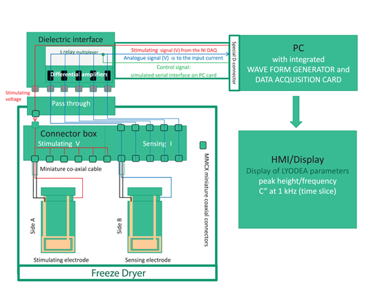 There are few examples whereby the measurement of electrical properties is used to provide information about a material during processing (4-6). This approach is in contrast to off-line electrical impedance measurements that are being used routinely to identify critical process events, such as phase transitions (i.e., freezing points and eutectics), against process set points (i.e., shelf temperature, and hence, product temperature during the pre-freezing stage) (7). By investigating the interrelations between the electrical properties and the structural characteristics of the solution, it might be possible to develop this technique towards a more comprehensive monitoring of the freeze-drying process. The development of an in-line technology based on impedance analysis, however, requires: