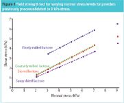 Figure 1 shows yield locus data, measured in the shear tests, for each of the samples. The finely milled lactose exhibits higher shear strength than the other materials, which have larger particles and tend to flow more freely. The spray-dried lactose has the lowest value of all, probably as a result of its spherical shaped particles.