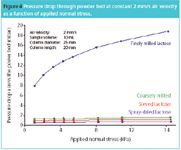 Interestingly, the finely milled lactose is associated with the lowest flow energy even though it has the highest shear strength. The compressibility, permeability and adhesion data for the samples shown in Table 1 helps interpretation of the flow energy measurements. Cohesive powders such as the finely milled lactose tend to contain relatively large amounts of air and are far more easily compressed. As a result the flow zone of material — the numbers of particles moving at any instant as the blade rotates and, therefore, the energy required to maintain flow — tends to be relatively small. In contrast, for noncohesive materials relatively large amounts of the sample are moved simultaneously as the blade is rotated and a higher flow energy is seen. These results highlight the dependency of flow energy measurements on a range of factors, not only shear strength, but also cohesion, compressibility and physical properties.