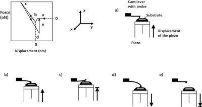 A force-versus-distance curve, such as shown in Figure 2, typically shows the deflection of the free end of the AFM cantilever as the fixed end of the cantilever is brought vertically towards and then away from the sample surface. Experimentally, this is done by applying a triangle-wave voltage pattern to the electrodes for the z-axis scanner. This causes the scanner to expand and then contract in the vertical direction, generating relative motion between the cantilever and sample. The deflection of the free end of the cantilever is measured and plotted at many points as the z-axis scanner extends the cantilever towards the surface and then retracts it again.
