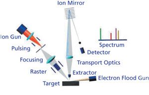 TOF-SIMS has the ability to obtain a depth profile and characterize a three-dimensional distribution of material components. A focused ion beam is rastered over a defined rectangular area on the surface of the sample to be analyzed (see