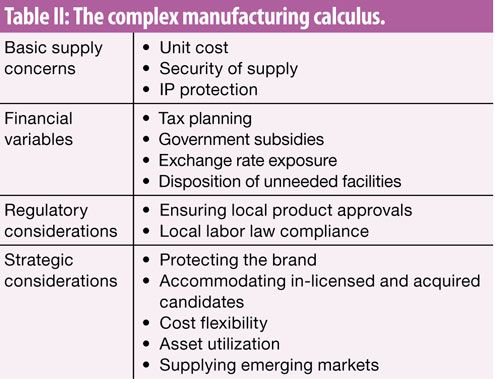 , global bio/pharma companies have a much broader array of objectives and options to consider when determining how to design their supply chains and whether to manufacture in-house or outsource, as follows: