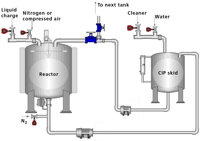 The principal objective of a CIP system is to achieve the desired cleanliness without disassembling the process equipment. Generally, CIP cleaning is performed by circulating cleaning solutions through pipes, pumps, valves, and spray devices that distribute the cleaner over the surface areas of the equipment. The cleaning process may include steps such as preparing cleaning solution to a pre-established concentration, heating the cleaning solution, circulating wash and rinse solutions over all equipment surfaces, and drying as needed.