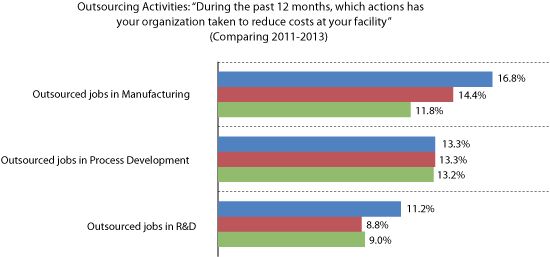 BioPlan asked organizations to identify which of several actions they had taken during the past 12 months to reduce costs at their facility (see Figure 3). The survey found 19 common actions associated with bioprocessing, and five of these were related to outsourcing. These five were near the bottom of the list. But it should be noted that they are growing. Last year, for example, 14% of respondents reported having outsourced manufacturing to domestic service providers to cut costs, while 12.6% offshored manufacturing as a cost-containment tool. Those percentages were roughly double the comparable figures from only to years earlier (7.1% and 5.7%, respectively).