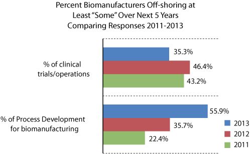 Data from the BioPlan study supports a growing trend towards international outsourcing of some activities. Responses were evaluated from 2011 to 2013 regarding the percentage of biomanufacturers that plan, within the next five years, to offshore at least some of various indicated activities ranging from process development to clinical trials and operations (see Figure 4). Significant growth was found in process development, a 33.5% numerical and 250% relative increase from 22.4% in 2011 to 55.9% this past year. Process development was the only area where over half of respondents plan to offshore in the next five years (although with increased emphasis on QbD and related quality issues, one would presume less offshoring of process design). Areas associated with biomanufacturing operations indicated a relatively smaller but still solid overall increase in expectations for offshoring, rising from 37.6% in 2011 to 50% in 2013.