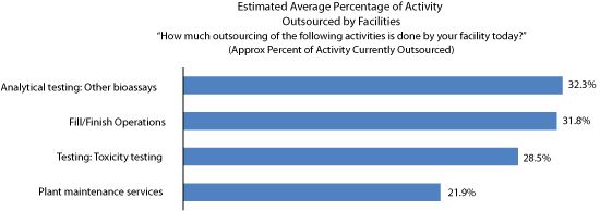 From the responses gathered, BioPlan estimated the average percentage of outsourcing done by biomanufacturers across the various activities listed. On average, facilities outsource 32.3% of analytical testing/bioassays (up from 27.6% in 2012 year), 31.8% of their fill/finish operations (down from 34.5%), and 28.5% (27.3% in 2012) of their toxicity testing (see Figure 2). It’s worth remembering that these numbers are averaged out among all facilities including those not outsourcing any of these activities. In essence, it’s an estimate as to how much of the market’s activity in these areas is kept in-house as opposed to being outsourced.