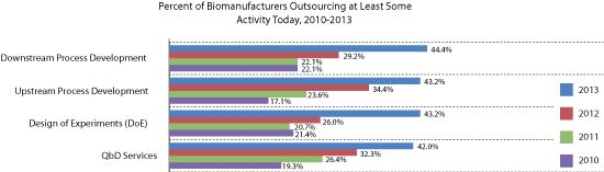Similarly, the proportion of respondents reporting having outsourced upstream process development has more than doubled since 2010, from 17.1% to 43.2%. Comparable rates of growth are also seen with outsourcing of design of experiments (from 21.4% to 43.2%) and quality-by-design (QbD) services (from 19.3% to 42%). These activities are still at the bottom of the list in terms of outsourcing popularity, but they are growing rapidly, signaling a greater degree of comfort on the part of clients with the technical expertise of their partners (see Figure 1).