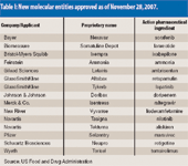 The approved 15 new drug applications (NDAs) for NMEs as of the end of November 2007 (see Table 1) and one new biologics application (BLA). This number is down from 2006 totals when FDA approved 22 new products (18 NDAs for NMES and four BLAs) (see Table II).