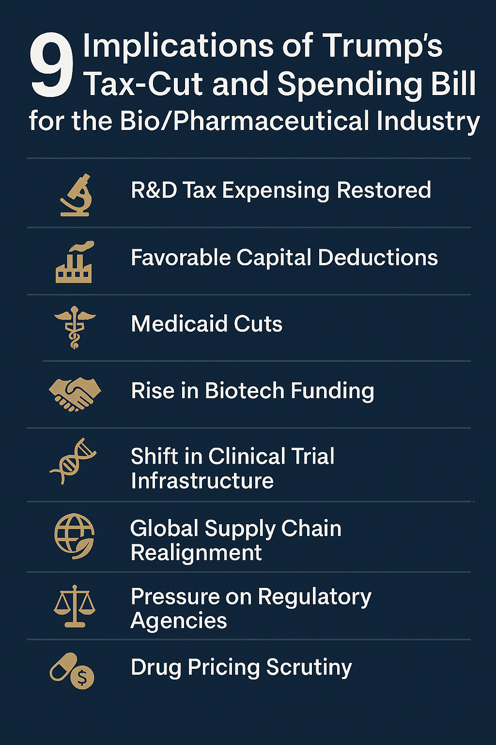 On July 3, 2025, the US House of Representatives passed President Donald Trump’s sweeping tax-cut and spending bill (1). Branded by supporters as a “pro-growth economic catalyst,” the legislation includes provisions that will reshape the strategic and operational landscape for the pharmaceutical and biotechnology sectors.