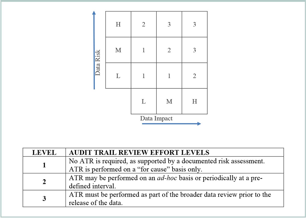 Figure 2. Determining the rigor of audit trail review (ATR) as a function of data risk and data impact.